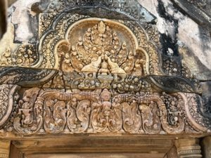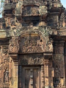 Am Nachmittag fahren wir hinaus aufs Land, um den prachtvollen Tempel Banteay Srei bestaunen zu können. Die “Zitadelle der Frauen” wurde zwischen dem 11. und 13. Jahrhundert erbaut. Banteay Srei ist der am besten erhaltene Tempel in Kambodscha und beherbergt einige der schönsten Beispiele für die klassische Baukunst der Khmer sowie bemerkenswerte feinste Steinschnitzereien, die den Hindu-Gott Shiva darstellen sollen. Noch immer sieht man die Spuren der Zerstörungen der Neuzeit durch Japaner, Franzosen und Amerikaner.