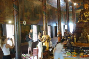 Heute ist sightseeing angesagt. Also früh los, damit wir vor den Massen vor Ort sind. Wir entdecken Phnom Penh City; die Hauptstadt liegt dort, wo die vier Arme des Mekong-Flusses Chaktomuk aufeinandertreffen. Phnom Penh ist seit mehr als 600 Jahren die historische Hauptstadt nach Angkor. Wir besichtigen den Königlichen Palast, der 1866 erbaut wurde, und die Silberpagode besichtigen, welche sich inmitten der Palastanlage befindet. Ein Großteil der dort ausgestellten Schätze sind Gaben des Königs von Kambodscha. Unter den Schätzen befindet sich ein massiver Gold-Buddha, der 90 Kilogramm wiegt und mit 9.584 Diamanten besetzt ist, die man aber nicht sieht. Außerdem gibt es dort einen kleinen, aus dem 17. Jahrhundert stammenden Buddha aus Smaragden, die man auch nicht sehen kann. Ausserdem gibt es dort einen kleinen, aus dem 17. Jahrhundert stammenden Buddha aus Smaragden und Baccarat-Kristallen, das grünem Glas sehr ähnlich sieht.