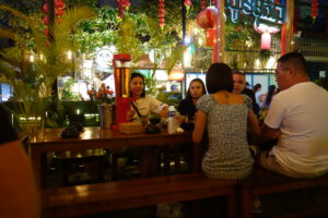 Es ist der letzte Abend in Kambodscha. Das noble Thai-Restaurant, in dem viele Chinesen und gut betuchte Touristen absteigen, behagt uns und unserem Geldbeutel nicht.
